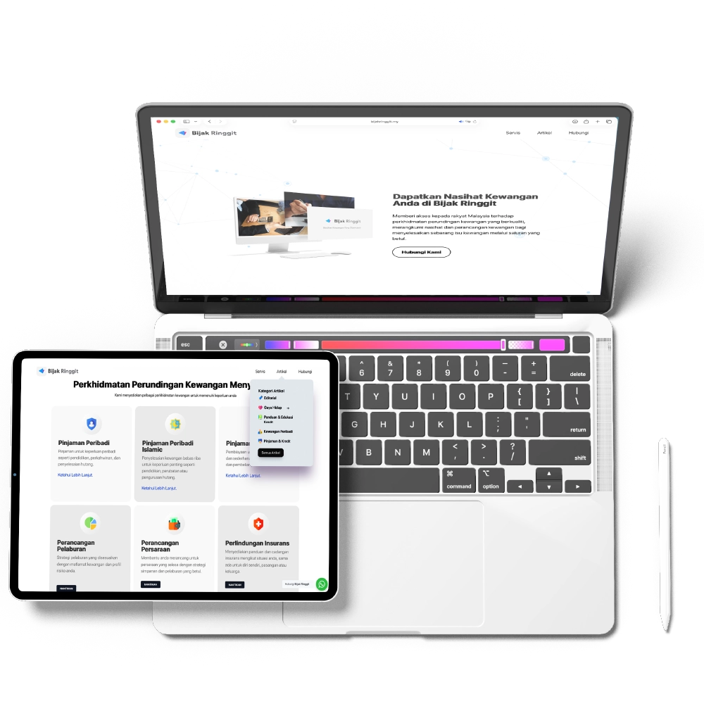 Kami mereka bentuk identiti jenama dan membangunkan laman web BijakRinggit dari kosong, bermula dengan pemahaman mendalam tentang objektif jenama: menjadikan ilmu kewangan peribadi lebih mudah diakses, difahami, dan diamalkan oleh rakyat Malaysia.